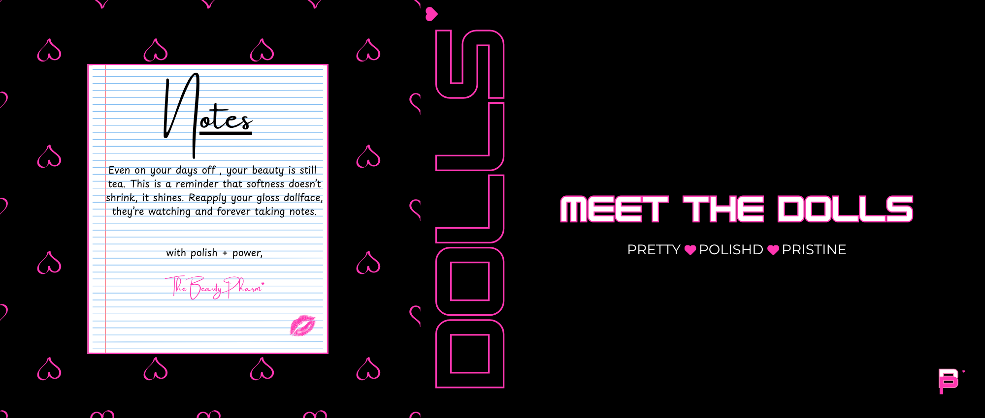 THIS MONTH'S EXTRA GLOSS GOES TO A TRUE DOLL FACE AMBASSADOR WHO'S BEEN REPPING THE BEAUTY PHARM WITH A SIGNATURE SHINE, PRESCRIPTION-PERFECT PROMO, AND A GLOW THAT NEVER FADES. FROM SHARING OUR PRODUCTS WITH PASSION TO SERVING CONSISTENT LOOKS THAT ALIGN WITH OUR BRAND'S VISION, THIS DOLL HAS GONE ABOVE AND BEYOND AND LOVE TO SEE IT
